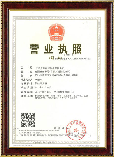 長沙龍翔標(biāo)牌制作有限公司地處星沙汽配城,公司產(chǎn)品主要包括銅、鋁、不銹鋼凹凸腐蝕標(biāo)牌、銘牌,鏡面標(biāo)牌、不銹鋼操作面板、噴沙面板等。同時承接絲網(wǎng)印刷、四色平印、PVC彩印,PC、PVC、PET面板、PC薄膜開關(guān)系列,并研發(fā)各類現(xiàn)代高難度工藝銘牌。